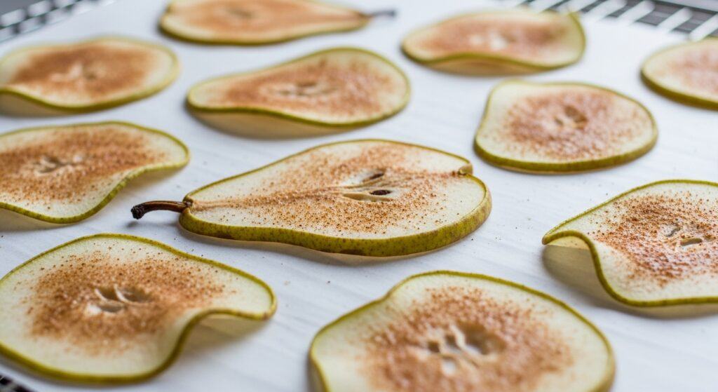 Choose pears that are just ripe — not soft. Slightly firm fruit will hold its shape and dry evenly, preventing sticky or leathery results.